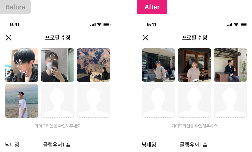 글램유저 1은 거울 셀카 대신 전체 분위기가 돋보이는 사진으로 변경하셔서 매칭률을 크게 높이셨습니다. 기존 사진의 얼굴이 더 잘나왔지만 더 높은 매칭률을 보인 건 분위기를 강조한 사진이었죠!